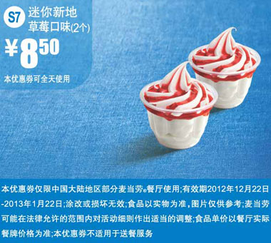 优惠券打印:麦当劳优惠券(2013年1月优惠券):迷你新地草莓口味(2个) 优惠价8.5元