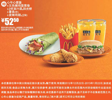优惠券打印:麦当劳优惠券(2013年1月优惠券):心年心意堡+五色嫩鸡菠菜卷+美汁源阳光橙+薯条(中)+麦辣鸡翅(2块) 优惠价52.5元