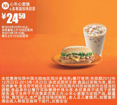 优惠券打印:麦当劳优惠券(2013年1月优惠券):心年心意堡+多果滋珍珠奶茶 优惠价24.5元
