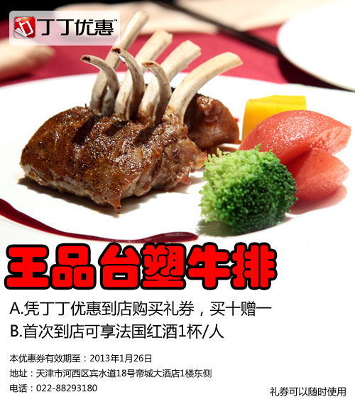 使用范围:仅限天津地区使用 使用说明: 凭此券可以享受以下优惠: A.凭丁丁优惠到店购买礼券,买十赠一, B.首次到店可享法国红酒1杯/人, 注:礼券可以随时使用。 本优惠劵有效期至:2013年01月26日 地址:天津市河西区宾水道18号帝城大酒店一楼东侧 电话:022-88293180
