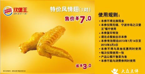 汉堡王优惠券(宁波汉堡王优惠券):特价风情翅(1对) 仅售7元 省3元使用说明如下: