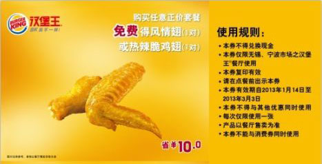 优惠券打印:汉堡王优惠券(宁波汉堡王优惠券):购买任意正价套餐 免费得风情翅(1对)或热辣脆鸡翅(1对) 省10元