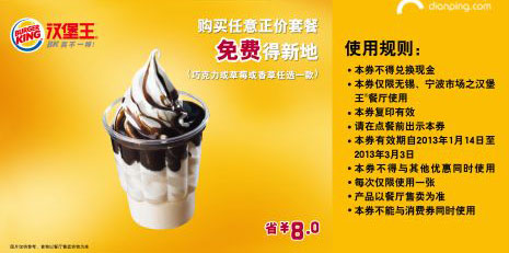优惠券打印:汉堡王优惠券(宁波汉堡王优惠券):购买任意正价套餐 免费得新地(巧克力或草莓或香草任选一款) 省8元
