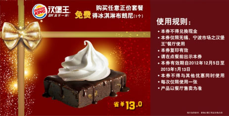 优惠券打印:汉堡王优惠券(宁波汉堡王优惠券):购买任意正价套餐免费得冰淇淋布朗尼(1个) 省13元
