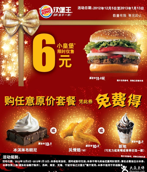 使用范围:仅限上海、苏州、南京、无锡、宁波之汉堡王餐厅使用 使用说明: 原价11元小皇堡仅售6元,售完即止,; 购任意原价套餐得指定产品,以上点餐前出示,除浦东机场餐厅,不外送, 12-12-5至13-1-13有效; 仅限上海、苏州、南京、无锡、宁波之汉堡王餐厅使用。