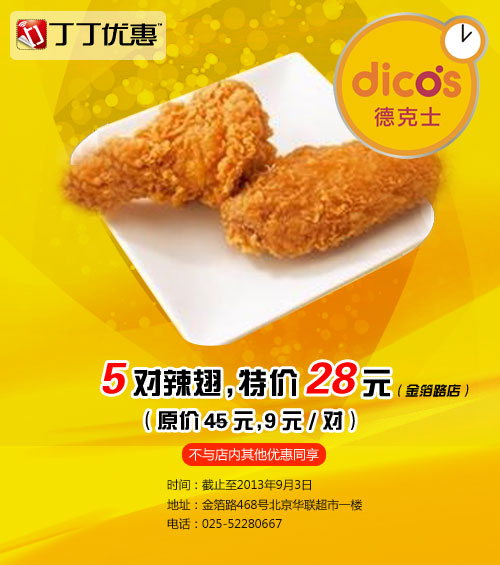 德克士优惠券(南京德克士优惠券):5对辣翅 仅售28元 省17元网址:http://www.ding8.com/youhuiquan.asp?Kid=3290&admin_id=&ID=31641&fw=