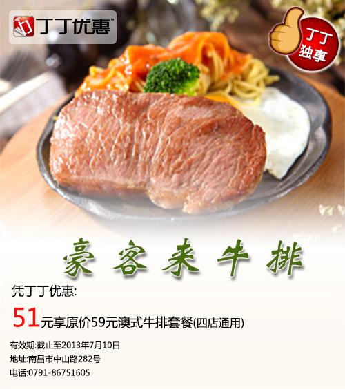 优惠券打印:豪客来优惠券(南昌豪客来优惠券):凭券51元享原价59元澳式牛排套餐