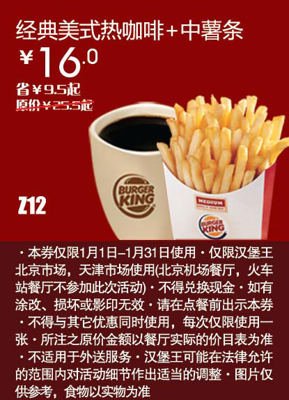优惠券打印:汉堡王优惠券(天津汉堡王优惠券):经典美式热咖啡+中薯条 优惠价16元 省9.5元