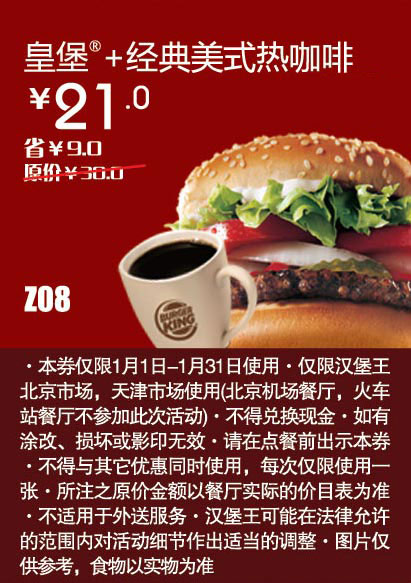 优惠券打印:汉堡王优惠券(天津汉堡王优惠券):皇堡+经典美式热咖啡 优惠价21元 省9元