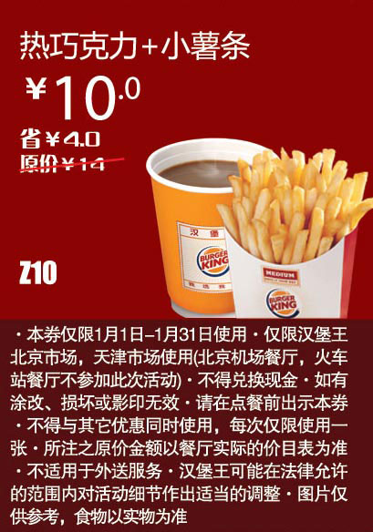 汉堡王优惠券(天津汉堡王优惠券):热巧克力+小薯条 优惠价10元 省4元使用说明如下: