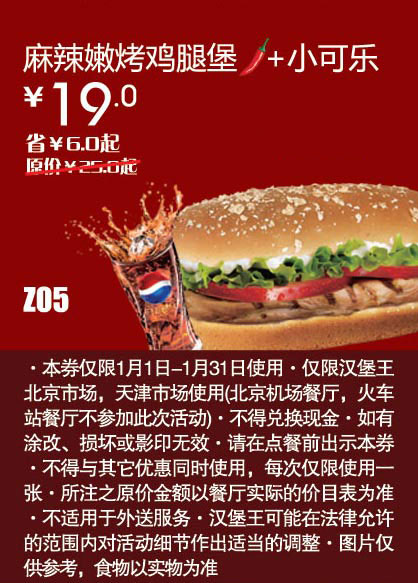 优惠券打印:汉堡王优惠券(天津汉堡王优惠券):麻辣嫩烤鸡腿堡+小可乐 优惠价19元 省6元
